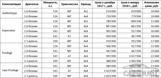 Как установили, повышение стоимости затронуло модели 2018 модельного года и достигает 15 000-27 000 рублей в зависимости от вида оснащения и силового агрегата. Так, Рено Дастер повысил ценник от 1,7% до 3,1%. Детальные изменения стоимости по видам наполнения представлены в таблице:
