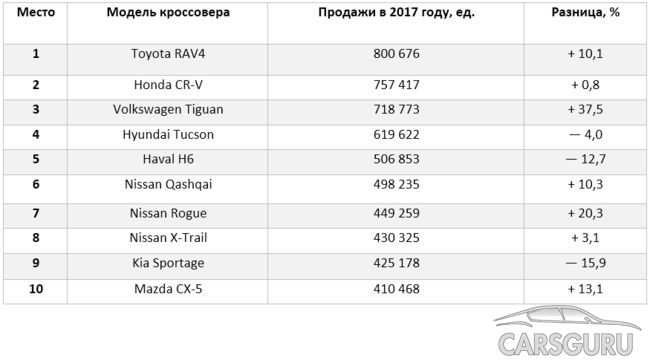 Третья строчка рейтинга у Volkswagen Tiguan, 718 800 проданных авто (+37,5%). Четвертая строчка досталась Hyundai Tucson — 619 600 ед. (-4%). Лидирующую пятерку замыкает Haval H6 — 506 900 ед. (-19,7%). На следующих трех строчках расположились модели Nissan. Шестым стал Qashqai — 498 200 ед. (+10,3%). Седьмое место — Rogue 498 200 ед. (+10,3%) и на восьмом месте X-Trail — 430 300 ед. (+3%). Предпоследнее место досталось KIA Sportage. Эта модель была продана в количестве 425 000 ед. (-16%). Замкнул рейтинг внедорожник Mazda CX-5 с показателем 410 500 реализованных авто (+13%).