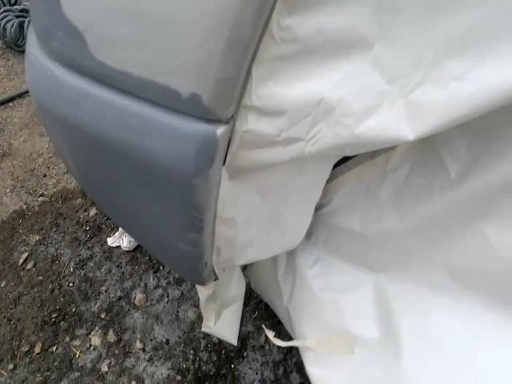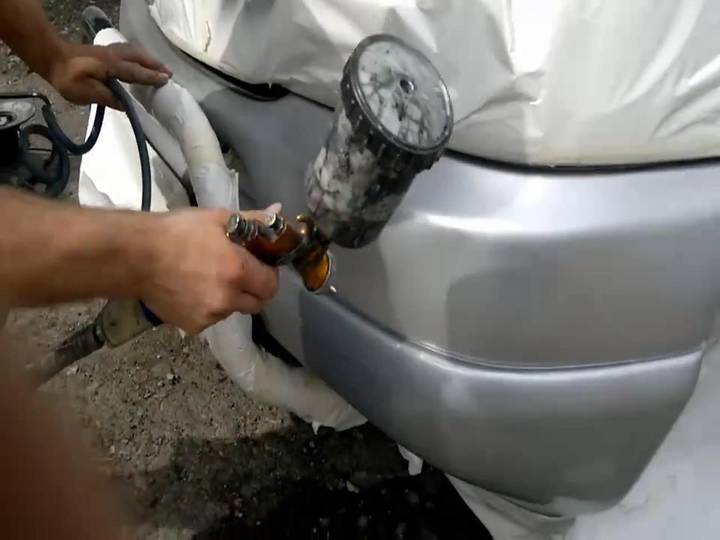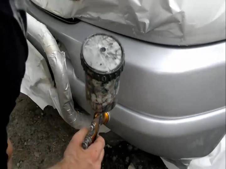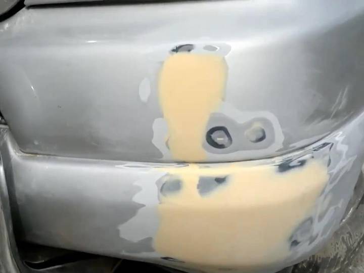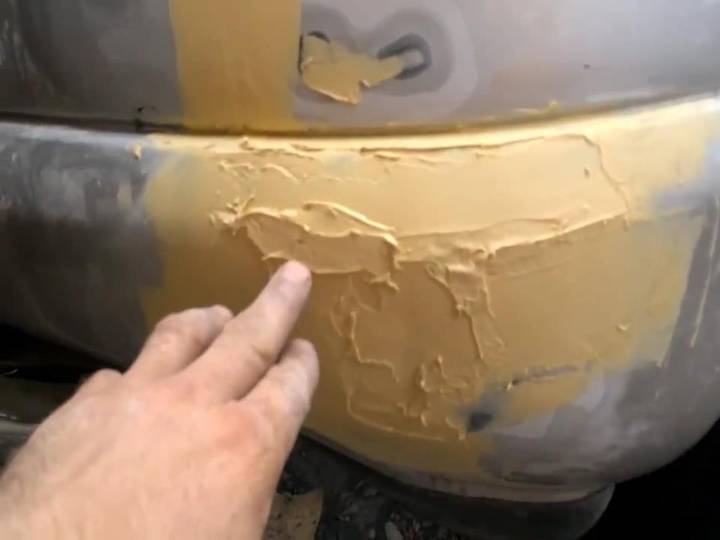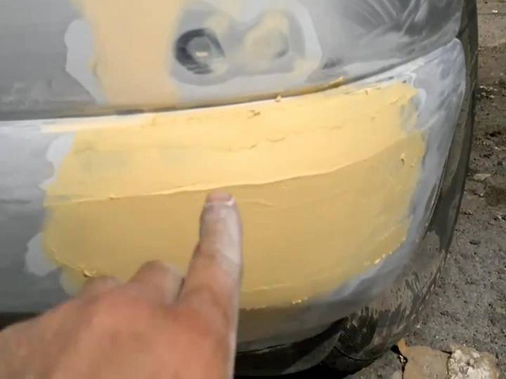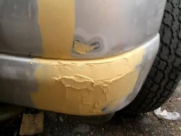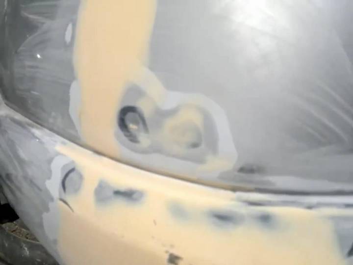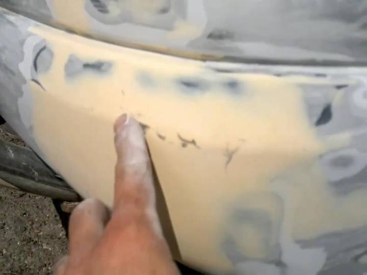 После этого нужно обезжирить место ремонта, подготовить шпаклевку и наложить ее на бампер.