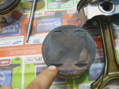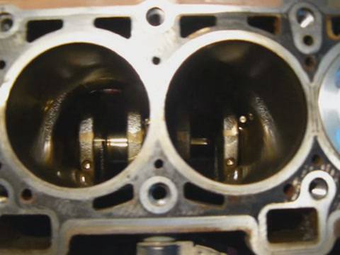 На фото можно увидеть заводские форсунки охлаждения поршней, которые размещены под наклоном и бьют заднюю часть поршня. Как видно, состояние шатунных шеек коленвала достаточно неплохое как для своего пробега. Отметим также, что поршневые кольца остались заводские и замен был только один поршень и прокладка ГБЦ (головки блока цилиндров).