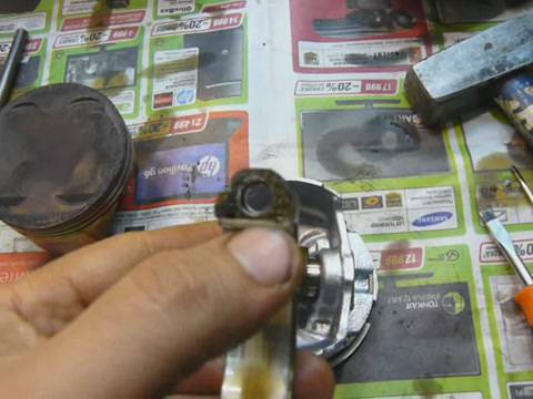 Рассмотрим теперь более детально стандартную ШПГ Приоры. В нашем случае она снята с автомобиля, который прошел немногим больше 50-ти тыс. км. Вкладыш по краям несколько изношен, что для Приоры, впрочем, нормально, потому что, как известно, шатун центруется не по коленвалу, а по поршню, который свободно двигается в цилиндре. Также на фото ниже можно наблюдать задиры на «юбках», которые также возникают от износа этой автомобильной детали.