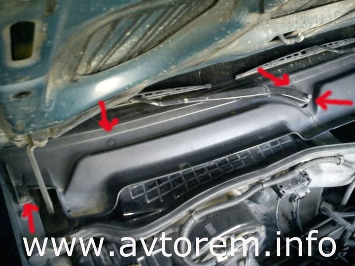 - открываем капот и демонтируем защиту фильтра. Для этого необходимо открутить крепежные винты, которые прикрыты декоративными пластиковыми заглушками. Ключом на 12 также скручиваем гайку, которая крепит стеклоочистительный тросик;