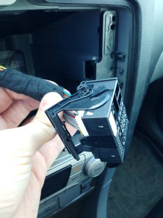 - аккуратно вытягиваем магнитолу из посадочного гнезда на себя. В задней части устройства обнаруживаем клеммник с соединительными проводами. Отстегиваем его и вынимаем из разъема на магнитоле;