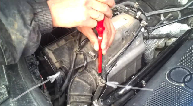 - получите доступ к посадочному гнезду фильтра. Для этого ослабьте хомут, который фиксирует патрубок воздуховода, и приподнимите защитный кожух;