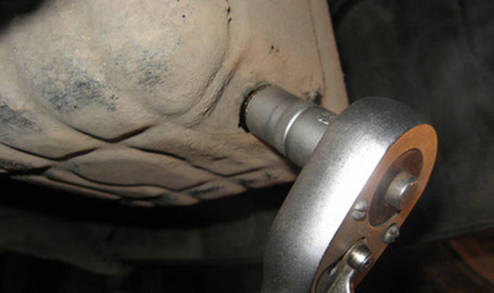 - перемещаемся в нижнюю часть машины и ключом выкручиваем пробку сливного отверстия;