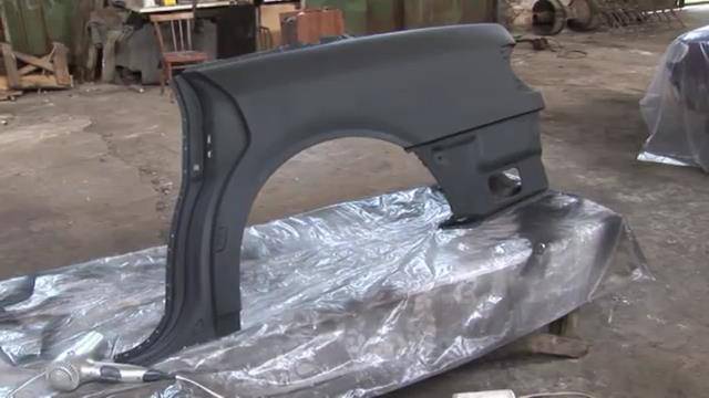 Следующий этап – наложение грунтовки на новое крыло. Нам необходимо будет подобрать цвет, который имеет вся машина (то есть – бордовый). Поэтому, цвет грунтовки должен быть черный.