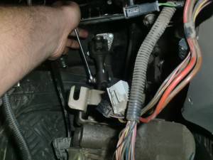 Выкручиваем крепление кронштейна и опускаем рулевое управление на пол автомобиля. С помощью ключа на 13 откручиваем крепление карданного вала к валу руля. Крепление зафиксировано с помощью болта, который аккуратно удаляется, а зажим клемм разжимаем обычной плоской отверткой. После этого можно извлечь промежуточный вал.