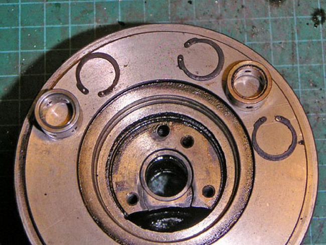 - Уплотнительные колечки закреплены с помощью стопорных колец, а втулки на валу закрепляются тройкой болтов T15. Наиболее часто люфт возникает по причине износа этих втулок. Вкладыш, расположенный на компрессорной части, фиксируется за счет одного стопорного кольца. А для крепления турбинного вкладыша используется два стопорных кольца.