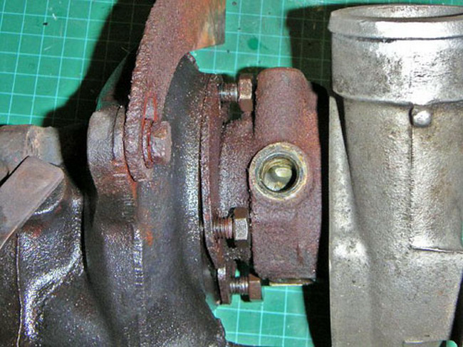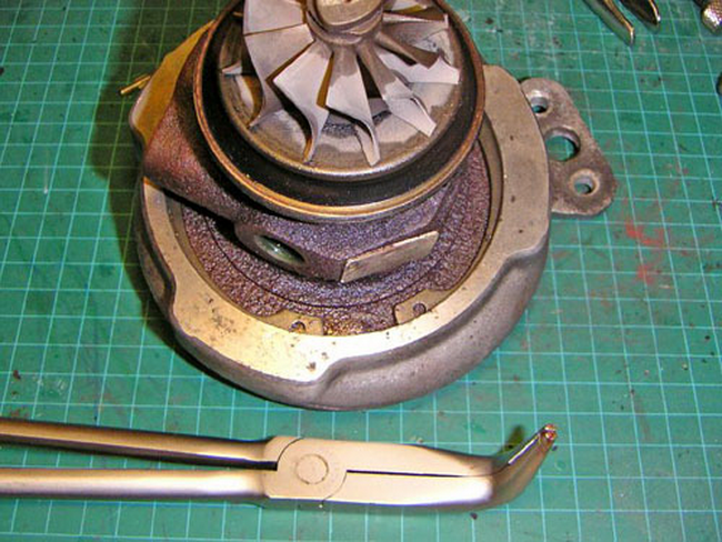 - Первым делом турбокомпрессор необходимо демонтировать. Для этого необходимо выкрутить все болты крепления горячей и компрессорной секций. Во время демонтажа компрессорной улитки чаще всего особых проблем не возникает. А вот секция, куда поступают выхлопные газы, часто прочно приваривается. Для ее демонтажа обычно используют несколько методов. Можно аккуратно сбить киянкой, но все лучше сначала воспользоваться для этой цели болтами крепления корпусов, которыми ее можно отодвинуть. Горячая секция располагается на конусе, поэтому крутить болты необходимо понемногу, хотя и с усилием, и следить за равномерностью. Это может оказаться сложным процессом, что объясняется особенностями конструкции турбокомпрессора. Изредка все же приходится брать в руки киянку.
