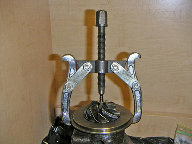 - Чаще всего компрессорная крыльчатка плотно сидит на валу, и для ее снятия понадобится стандартный универсальный съемник. Перед этим желательно засечь расположение гайки по отношению к компрессорному колесу. Таким образом можно уменьшить риск нарушения балансировки после сборки.