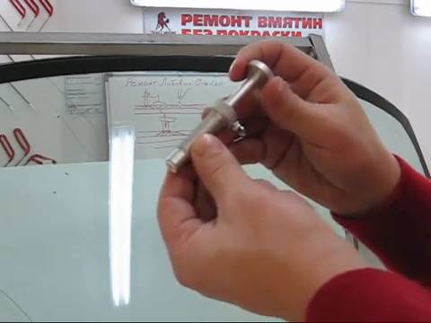 Рассмотрим достаточно интересный пример ремонта повреждения лобового стекла, которое образовалось в результате попадания двух камней. Чтобы трещина не распространялась, нужно выполнить высверливание. Для образования отверстия вставляет иголку и выполняем по ней удар в месте высверливания. Доводим трещину к искусственному сколу, чтобы она в нем остановилась. Полимер будет заполнять как скол, так и трещину.