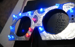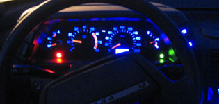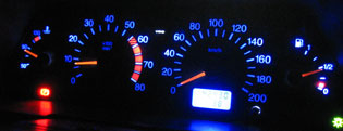 1.Шесть светодиодов (соответственно, шесть резисторов, которые имеют сопротивление 850 Ом). Из них, один синий (лучше взять 3-х миллиметровый) с хорошо сточенной колбой и пять белого цвета, очень ярких по 5мм. На двух, которые сверху, нужно сточить линзу и проделать сверлом внутренний конус. Далее следует залить его клеем. Потом светодиоды стоит вставить в патроны ламп и в приборный щиток.