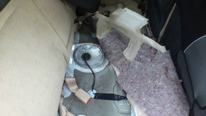 Для получения доступа к фильтру, который вместе с насосом располагается в топливном баке, необходимо снять подушку заднего сидения и отвернуть изоляционную обивку днища. Покрытие заведено за задние спинки.