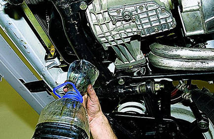 - сливается отработанное масло. Перед откручиванием болта сливного отверстия (ключ на 14), следует снять крышку заливной горловины в моторном отсеке;