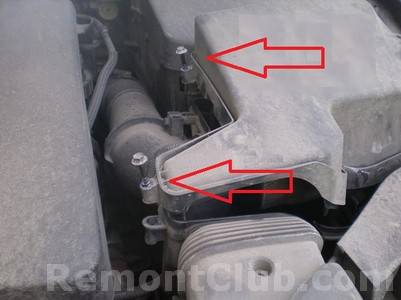 - откройте капот и найдите крышку-кожух воздушного фильтра. На фото красной стрелкой показаны болты, фиксирующие крышку. Откручивая их не переживайте, что они провалятся вниз – специальная конструкция позволяет им надежно держаться на корпусе;